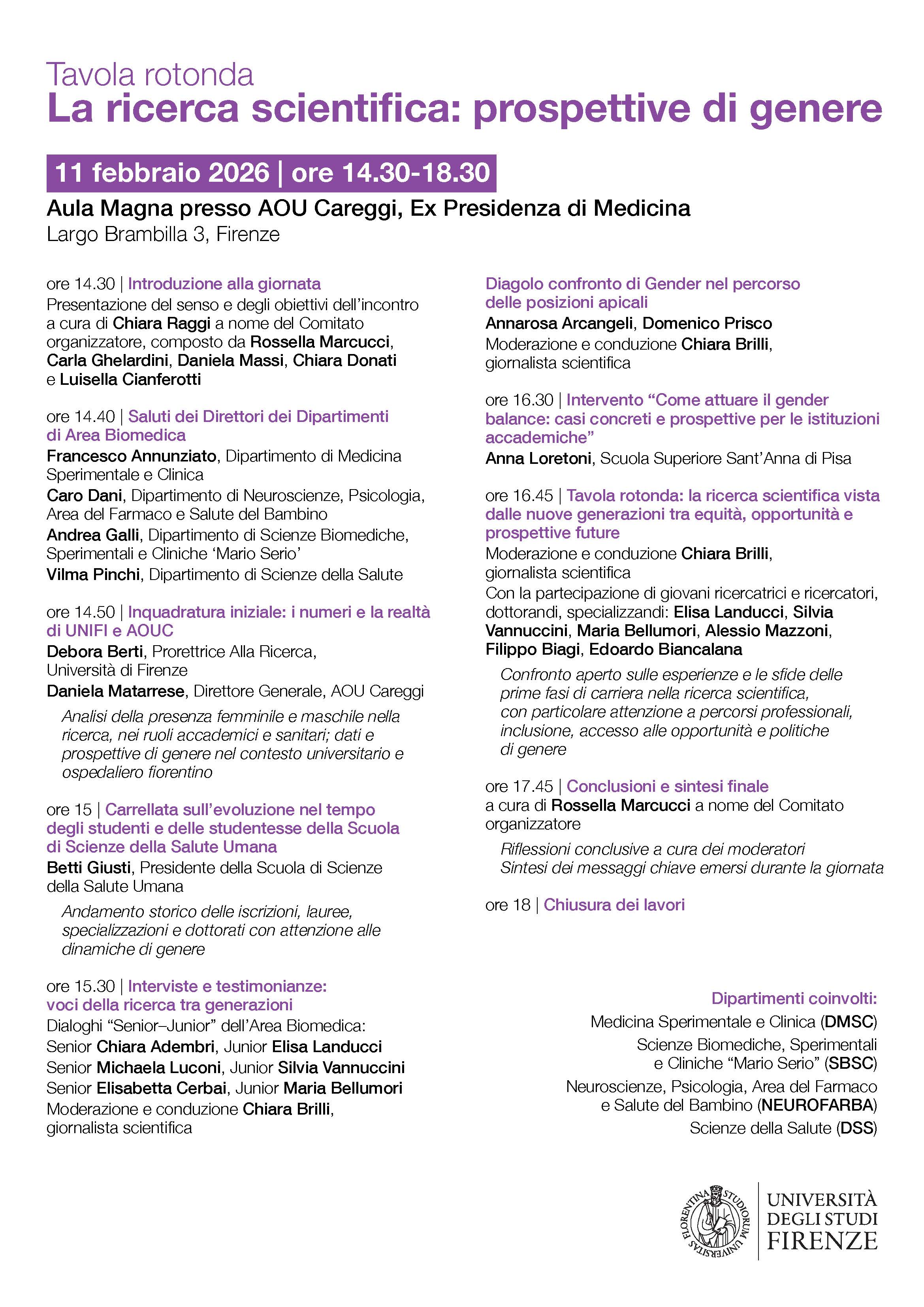 La tavola rotonda dell'Area Biomedica sarà un momento di confronto interno tra Dipartimenti, con la partecipazione di Direzioni, docenti, ricercatrici e ricercatori, specializzandi e dottorandi, per riflettere insieme su dati istitiuzionali, dinamiche di genere e prospettive future.